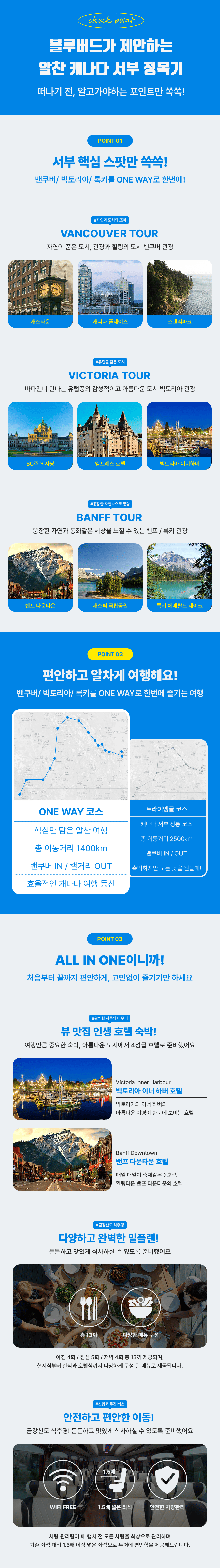 • 모든 일정 및 픽업/드랍 장소는 현지의 사정에 의해 사전 통지 없이 변경 또는 취소될 수 있습니다. • 여행 중 발생될 수 있는 분실 및 안전사고에 대하여 본사는 책임이 없음을 알려드리오니, 귀중품 및 현금 등의 분실사고와 개인의 안전사고에 대하여 각별히 유의하여 주시기 바랍니다. • 여행자보험은 불포함이므로 개인적으로 준비하셔야 합니다. • 투어 진행시 인원에 따라 그에 적합한 차량이 배정될 수 있습니다. • 투어 차량 탑승 시 투어 당일 탑승지에 도착한 순서대로 탑승합니다. • 모든 선택관광은 필수가 아닌 원하시는 것만 선택 진행이 가능하며, 개별적으로 티켓을 구매하여 사용하는 것은 불가능합니다. • 차량 내에는 커피, 음료 등 음식물 반입이 금지됩니다. • 캐나다 전 지역 호텔은 금연으로 객실을 포함한 실내에서 흡연 시 $2,000 상당의 벌금이 부과 될 수 있습니다. • 시애틀(미국) 출발/하차 시 학생 및 어린이 할인 요금이 적용되지 않습니다. (성인 요금 적용) • 시애틀(미국) 하차 셔틀의 경우 일 1회 운영되기 때문에 록키 후 밴쿠버 지역 호텔에서 다른 시애틀행 손님들의 귀환을 다소 대기 하실 수 있는 점 양해 부탁 드립니다. • 시애틀(미국) 출발/하차 시 최소 4인 이상 시 가능하며, 비용 추가 됩니다. • 호텔은 예약 시점 및 현지 사정에 따라 일정표 상 안내 된 호텔 또는 동급 호텔로 사전안내 없이 대체 될 수 있습니다. • 호텔 객실 상황에 따라 객실 내 침대가 1 King Bed 객실로 배정될 수 있는 점 참고 바랍니다. • 밴쿠버+록키+빅토리아 6박7일 상품은 1인실 싱글룸 이용이 불가합니다. 최소 2인부터 이용 가능합니다. |