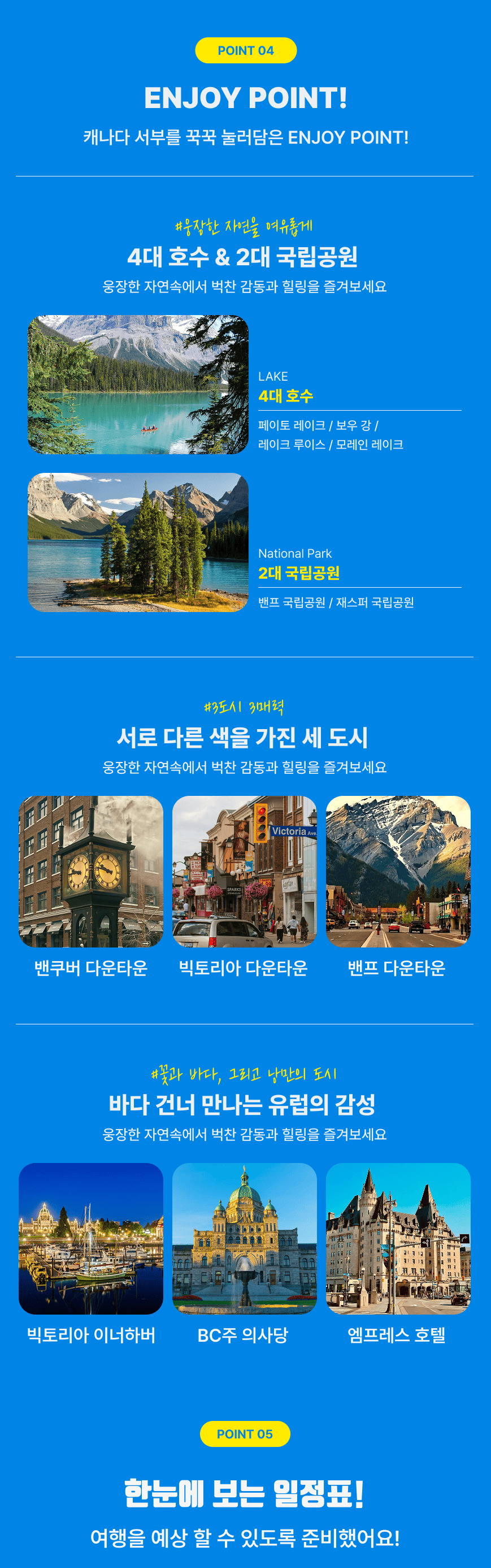 | [밴쿠버IN/캘거리OUT] 밴쿠버+빅토리아+록키 4박5일 | 4박 5일 | 밴쿠버 | CAD 1,714 | CAD 1,691 | CAD 1,668 | CAD 2,070 |
